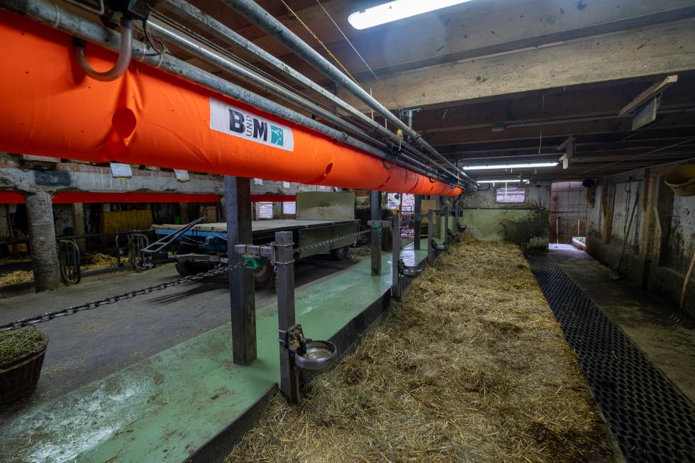 Durch den auf Mass gefertigten Lüftungsschlauch ist die geringe Deckenhöhe gar kein Problem. Der Frischluftschlauch bringt zielgerichtet, ohne Zug frische Luft in den Stall und verbessert das Tierwohl so deutlich.