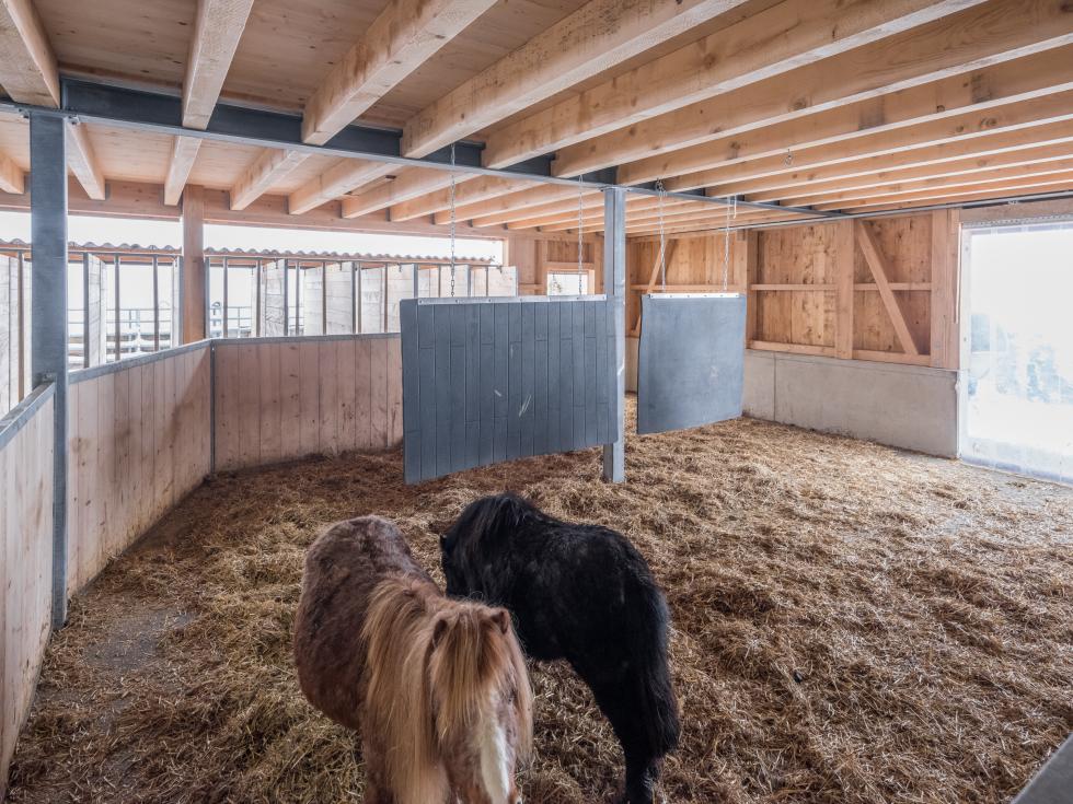 Dans un coin de l'étable, on installe par exemple deux parois frontales avec des portes coulissantes dont le sens d'ouverture fait face au mur. Ainsi, le box de séparation peut être laissé ouvert lorsqu'il n'est pas utilisé. Les chevaux peuvent ainsi utiliser le box comme lieu de retraite ouvert.