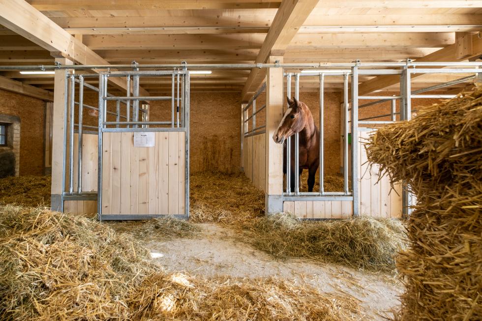 À Guggisberg, nous avons pu installer des boxes individuels de type "Aaretal" avec des cornadis sécurisés intégrées dans la paroi frontale. La deuxième partie de l'écurie, un système de détention en groupe, séduit par sa flexibilité par rapport à la taille des boxes. L'alimentation des chevaux se fait également dans le couloir de l'écurie - ce qui aide à organiser efficacement le travail quotidien.