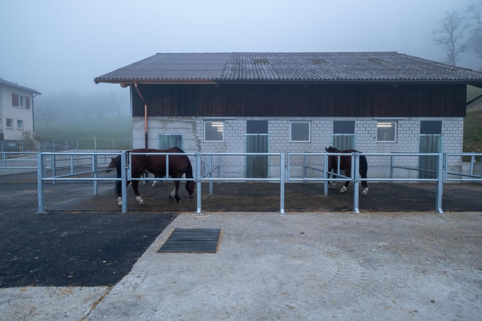 Cet objet prouve qu'il n'est pas toujours nécessaire de choisir entre la détention en boxes ou en groupe : grâce au système flexible, les chevaux bénéficient de beaucoup de contacts sociaux et de beaucoup d'espace. Le propriétaire peut ouvrir les parois pivotantes des boxes et les séparations des paddocks en un tour de main, ce qui permet de créer une écurie de groupe. La vidéo montre de manière impressionnante comment cela fonctionne exactement.